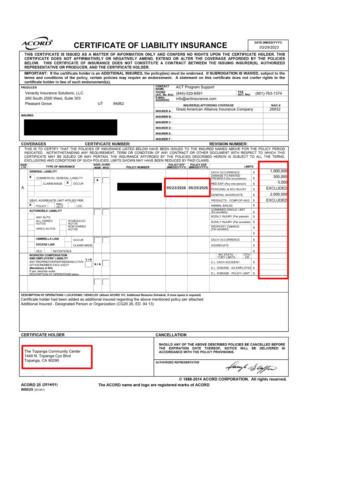 3. Certificate of Commercial General Liability Insurance (see example here). The Commercial General Liability Insurance Certificate should state limits not less than $1,000,000 for Each Occurrence, Personal and Adv Injury Liability & General Aggregate. Please add the “Topanga Community Center,” 1440 N Topanga Boulevard, Topanga, CA 90290’ as Additional Insured. In case your business is not covered by a Commercial General Liability Insurance, please have a look at the ACT Insurance website.